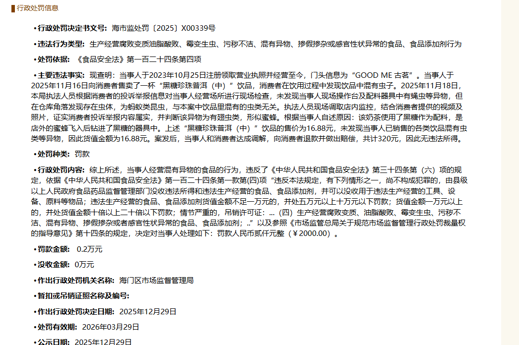 次要违法现实:现查明:当事人于2023年10月25日注册领取停业执照并运营至今,门头消息为“GOOD ME 古茗”。当事人于2025年11月16日向消费者售卖了一杯“黑糖珍珠普洱(中)”饮品,消费者正在饮用过程中发觉饮品中混有虫子。2025年11月18日,本局法律人员按照消费者的赞扬举报消息对当事人运营场合进行现场查抄,未发觉当事人现场操做台及配料器具中有蝇虫等异物,但正在仓库角削发现存正在虫体,为蚂蚁类虫豸,取本案中饮品里混有的虫类无关。法律人员现场调取店内,连系消费者供给的视频及照片,消费者赞扬举报内容失实,并判断该异物为有翅虫类,形似蜜蜂。按照当事分缘由:该奶茶利用了黑糖做为配料,是店外的蜜蜂飞入后钻进了黑糖的器具中。上述“黑糖珍珠普洱(中)”饮品的售价为16。88元,因而货值金额为16。88元。案发后,当事人和消费者告竣调整,向消费者退款并做出补偿,因而无违法所得。