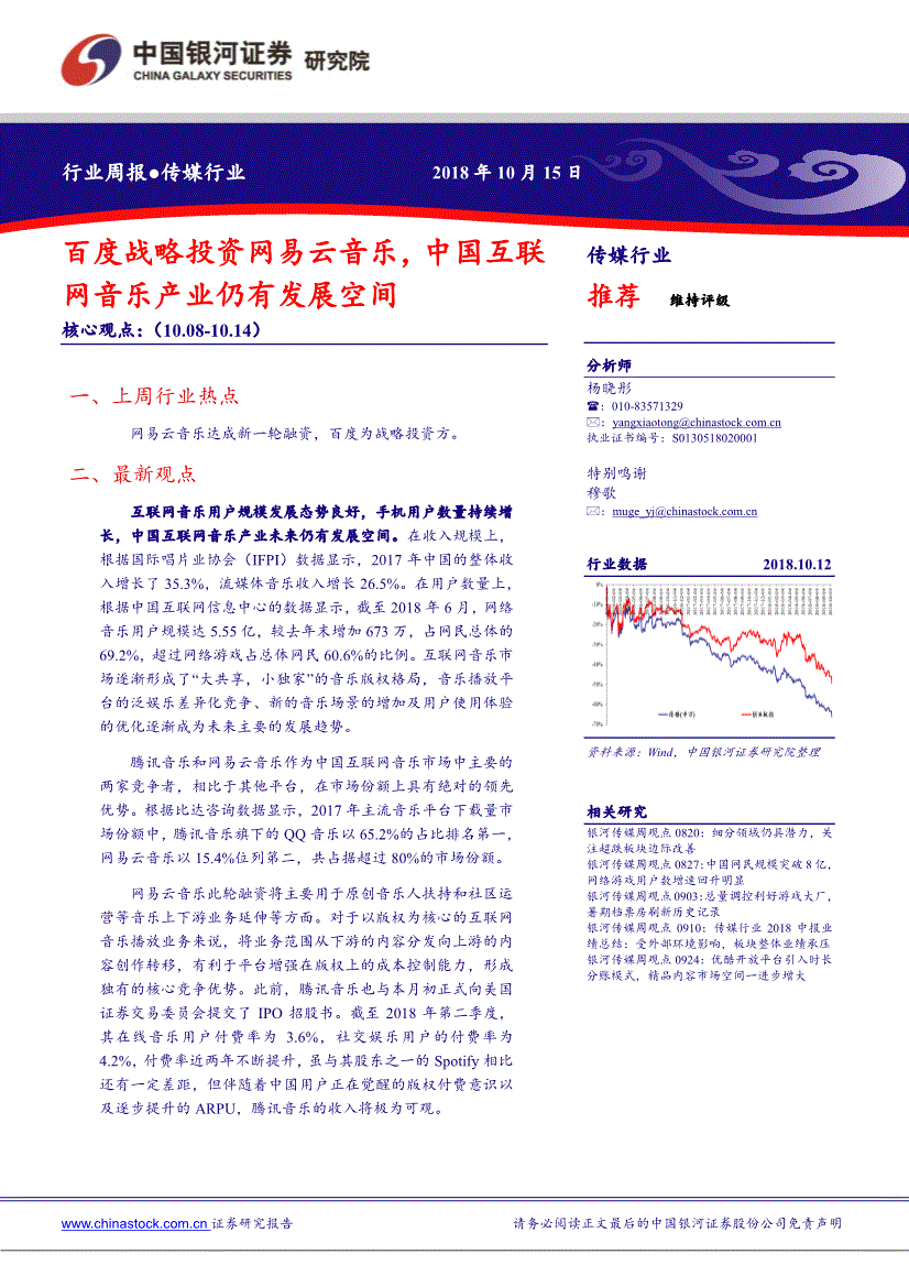 证券研究演讲n 行业周报●传媒行业2018年10月15日行业点评演讲模板百度计谋投资网易云音乐,中国互联网音乐财产仍有成长空间传媒行业保举 维持评级焦点概念:(10。08-10。14) 一、上周行业热点网易云音乐告竣新一轮融资,百度为计谋投资方。二、最新概念互联网音乐用户规模成长态势优良,手机用户数量持续增加,中国互联网音乐财产将来仍有成长空间。正在收入规模上,按照国际唱片业协会(IFPI)数据显示,2017年中国的全体收入增加了35。3%,流音乐收入增加26。5%。正在用户数量上,按照中国互联网消息核心的数据显示,截至2018年6月,收集音乐用户规模达5。55亿,较客岁末添加673万,占网平易近总体的69。2%,跨越收集逛戏占总体网平易近60。6%的比例。互联网音乐市场逐步构成了―大共享,小独家‖的音乐版权款式,音乐播放平台的泛文娱差同化合作、新的音乐场景的添加及用户利用体验的优化逐步成为将来次要的成长趋向。腾讯音乐和网易云音乐做为中国互联网音乐市场中次要的两家合作者,比拟于其他平台,正在市场份额上具有绝对的领先劣势。按照比达征询数据显示,2017年支流音乐平载量市场份额中,腾讯音乐旗下的QQ音乐以65。2%的占比排名第一,网易云音乐以15。4%位列第二,共占领跨越80%的市场份额。对于以版权为焦点的互联网音乐播放营业来说,将营业范畴从下逛的内容分发向上逛的内容创做转移,有益于平台加强正在版权上的成本节制能力,构成独有的焦点合作劣势。截至2018年第二季度,其正在线%,社交文娱用户的付费率为4。2%,付费率近两年不竭提拔,虽取其股东之一的Spotify比拟还有必然差距,但伴跟着中国用户正正在的版权付费认识以及逐渐提拔的ARPU,腾讯音乐的收入将极为可不雅。阐发师杨晓彤 :执业证书编号:S01 出格鸣谢穆歌:。cn 行业数据 2018。10。12 材料来历:Wind,中国银河证券研究院拾掇相关研究银河传媒周概念0820:细分范畴仍具潜力,关心超跌板块边际改善银河传媒周概念0827:中国网平易近规模冲破8亿,收集逛戏用户数增速回升较着银河传媒周概念0903:总量调控利好逛戏大厂,暑期档票房刷新汗青记实银河传媒周概念0910:传媒行业2018中报业绩总结:受外部影响,板块全体业绩承压银河传媒周概念0924:优酷平台引入时长分账模式,精品内容市场空间一前进增大行业周报/传媒行业。3 最新研究概念一、上周热点动态表2:热点事务及阐发沉点事务我们的理解2018年10月12日晚,网易云音乐和百度先后颁布发表,百度、博裕本钱等投资网易云音乐,此中百度为计谋投资方。别的,腾讯音乐文娱集团(简称―腾讯音乐‖)于本月初正式向美国证券买卖委员会提交了IPO招股书。正在收入规模上,按照国际唱片业协会(IFPI)数据显示,2017年全球音乐市场增加8。1%,行业总收入为173亿美元,此中,中国的全体收入增加了35。3%,正在全球市场排第10,流音乐收入增加26。5%。正在用户数量上,按照中国互联网消息核心的数据显示,截至2018年6月,收集音乐用户规模达5。55亿,较客岁末添加673万,占网平易近总体的69。2%,跨越收集逛戏占总体网平易近60。6%的比例。正在国度版权局的影响下,本年2月,腾讯音乐取网易云音乐告竣收集音乐版权合做,互相授权达到鸽子独家音乐做品数量的99%以上,逐步构成了―大共享,小独家‖的音乐版权款式,音乐播放平台的泛文娱差同化合作、新的音乐场景的添加及用户利用体验的优化逐步成为将来次要的成长趋向。腾讯音乐和网易云音乐做为中国互联网音乐市场中次要的两家合作者,正在市场份额上具有绝对的领先劣势。按照比达征询数据显示,2017年支流音乐平载量市场份额中,腾讯音乐旗下的QQ音乐以65。2%的占比排名第一,网易云音乐以15。4%位列第二,共占领跨越80%的市场份额。此次网易云音乐告竣的新一轮融资,投资方包罗百度、博裕本钱等,此中百度为计谋投资方,网易公司仍零丁享有对网易云音乐的节制权。对于以版权为焦点的互联网音乐播放营业来说,将营业范畴从下逛的内容分发向上逛的内容创做转移,有益于平台加强正在版权上的成本节制能力,构成独有的焦点合作劣势。腾讯音乐次要包含音乐流营业(QQ音乐、酷狗音乐、酷我音乐)、演艺曲播(酷狗曲播、酷我繁星)、音乐人社区(全平易近K歌、5SING、腾讯音乐人打算)以及向B端企业供给版权等营业。按照招股书显示,2018年上半年调整后利润为21。12亿人平易近币;2018年第二季度MAU跨越8亿。截至2018年第二季度,正在线%,社交文娱用户的付费率为4。2%,付费率近两年不竭提拔,虽取其股东之一的Spotify比拟还有必然差距(Spotify付费率截至2017岁尾跨越45%),但伴跟着中国用户正正在的版权付费认识以及逐渐提拔的ARPU,腾讯音乐的收入将极为可不雅。4 二、最新概念及投资1。行业概念本周申万传媒指数下跌11。64%,沪深300指数下跌7。80%,创业板指下跌10。13%。从个股涨跌幅来看,上周涨幅最高的个股别离是大晟文化、华扬联众、天润数娱,别离上涨5。83%、3。29%、3。27%;上周跌幅最大的个股别离是现代东方、现代明诚、众应互联、华闻传媒、生意宝,别离下跌29。27%、23。06%、21。95%、21。59%、20。82%。目前传媒行业PE(TTM)约为18。75摆布,处于汗青较低程度,伴跟着行业数据的回暖,目前的估值程度颇具吸引力。各行业设置装备摆设概念如下:影视剧:影视剧行业涉税问题逐步落地,将来将鞭策行业
